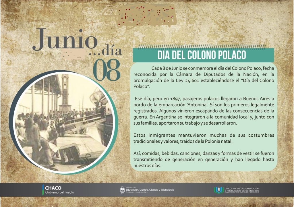 En 1995, mediante la ley 24.601 se declaró el 8 de junio como el Día del Colono Polaco.