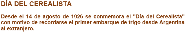 La primera exportación fue el resultado de la política de intercambio comercial llevada a cabo por Nicolás Avellaneda, quien había asumido los destinos del país en 1874. Con la intención de dedicarle a los trabajadores del agro un día para homenajear y reconocer su actividad, el Consejo Directivo de la Bolsa de Cereales de Buenos Aires resolvió instaurar el 14 de agosto como la fecha en que se celebrara el Día del Cerealista.