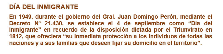 Se celebra en este día en la Argentina por Decreto Nº 21.430 del año 1949, durante la presidencia de Juan Domingo Perón. Se eligió esa fecha para recordar la llegada de los inmigrantes al país de acuerdo con la disposición dictada por el Primer Triunvirato en 1812, que ofreciera “su inmediata protección a los individuos de todas las naciones y a sus familias que deseen fijar su domicilio en el territorio”.